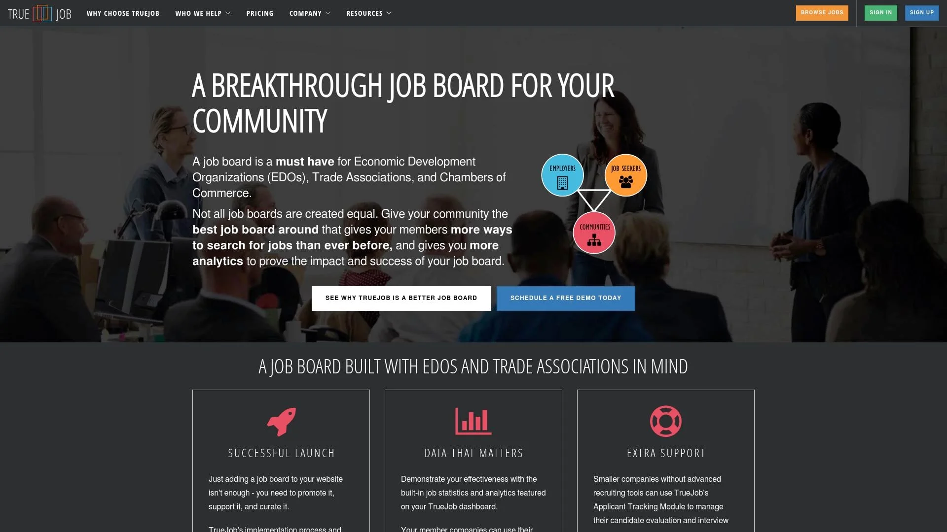 TrueJob specializes in job boards for community-focused organizations: EDOs, chambers of commerce, and trade associations. The platform emphasizes demonstrating economic impact through built-in analytics and reporting.